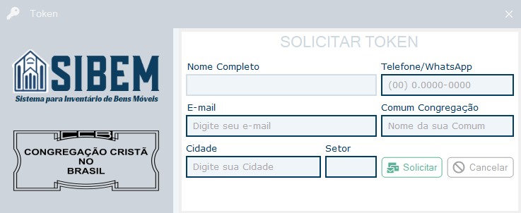 Na primeira execução do sistema, será necessário solicitar um token de acesso. Para isso, basta clicar no botão Solicitar Token